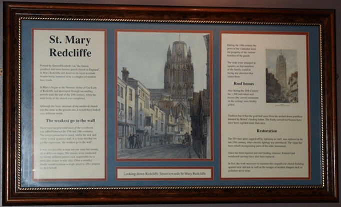 The text reads: Praised by Queen Elizabeth I as ‘the fairest, goodliest and most famous parish church in England’, St Mary Redcliffe still deserves its royal accolade despite being hemmed in by a complex of modern busy roads.