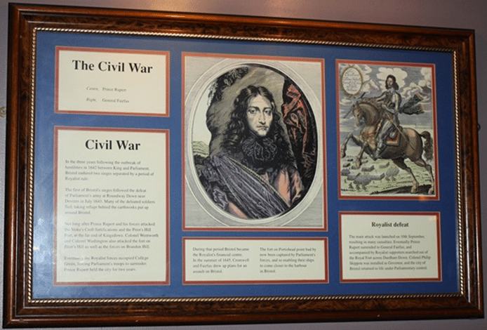 Not long after, Prince Rupert and his forces attacked the Stoke’s Croft fortifications and the Prior’s Hill Fort, at the far end of Kingsdown. Colonel Wentworth and Colonel Washington also attacked the fort on Prior’s Hill as well as the forces on Brandon Hill.