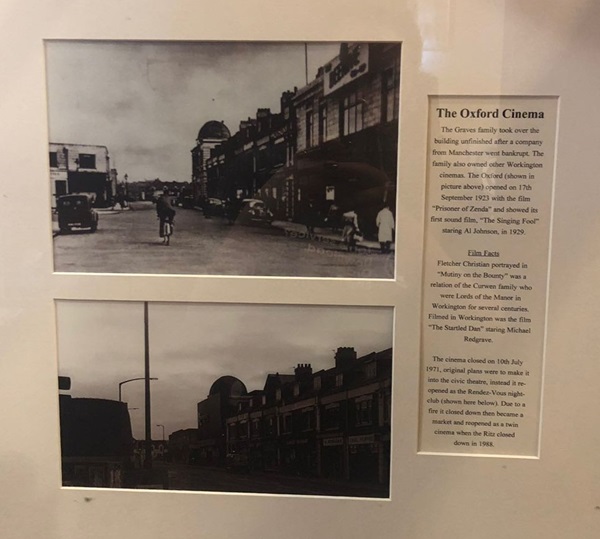 The text reads: The Graves family took over the building unfinished after a company from Manchester went bankrupt. The family also owned other Workington cinemas. The Oxford (shown in the top photograph) opened on 17 September 1923 with the film Prisoner of Zenda and showed its first sound film, The Singing Fool, starring Al Johnson, in 1929.